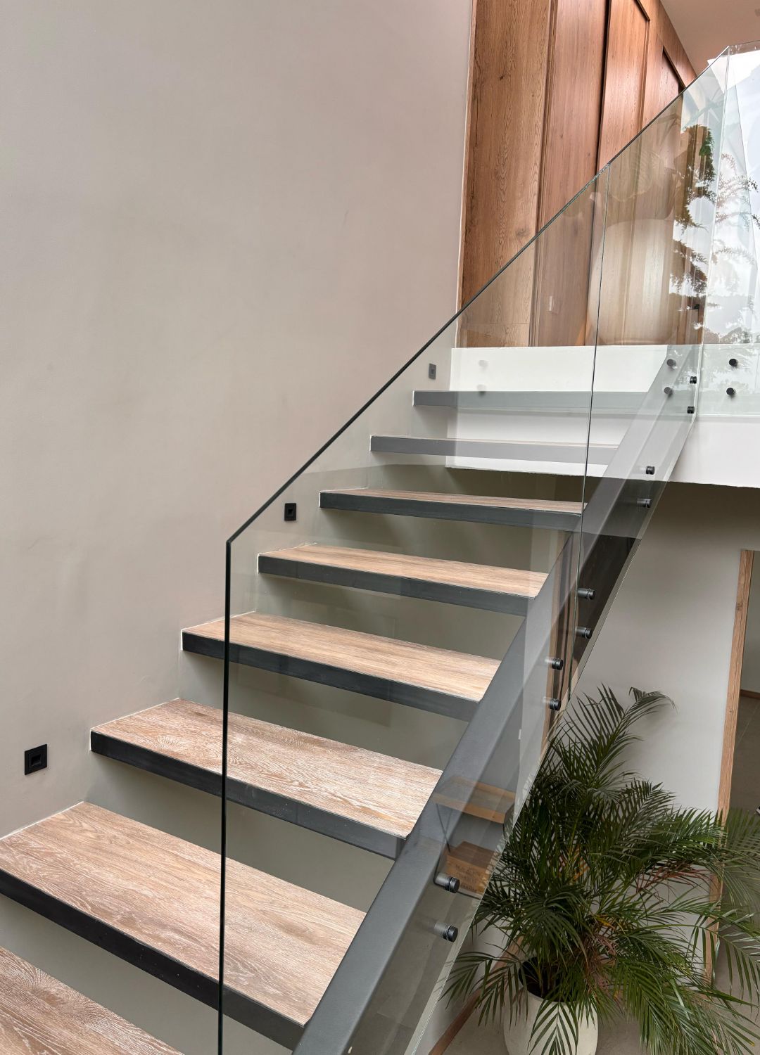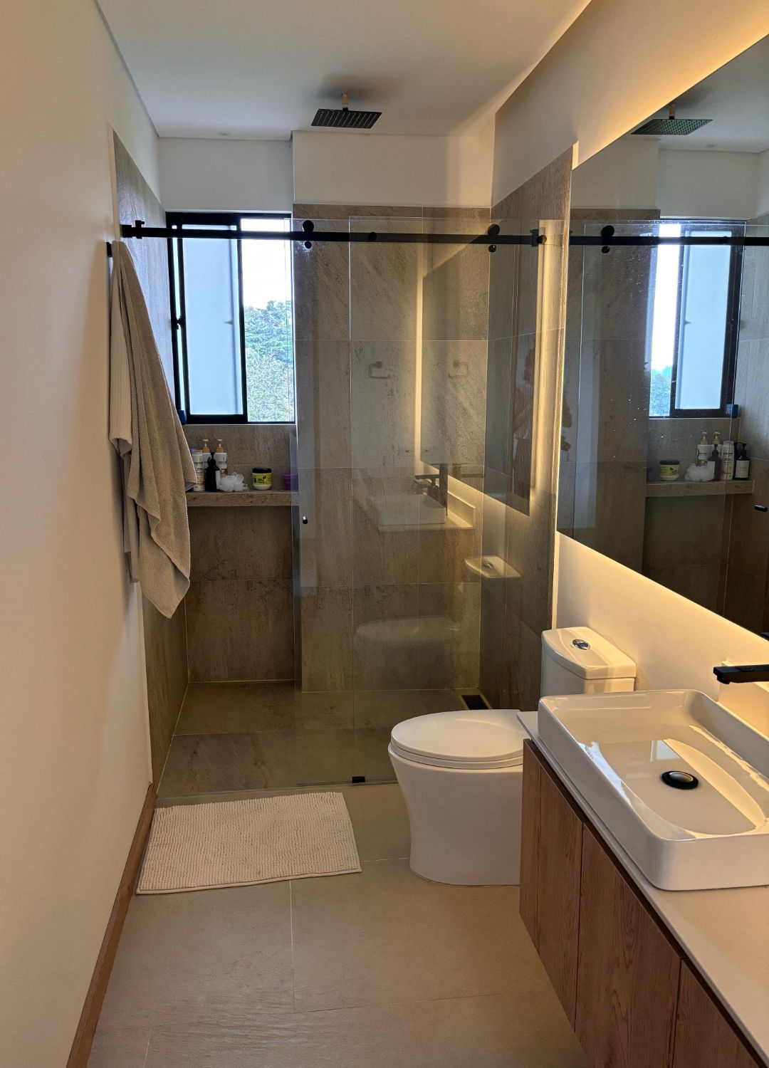 También realizamos cabinas de baño en vidrio templado de 8 mm con sistema deslizante. Su apertura suave facilita el uso diario, mientras que el vidrio claro y los accesorios en color negro mantienen la amplitud visual, aportan modernidad y se integran de forma perfecta con los acabados cálidos y el estilo relajado del diseño interior.