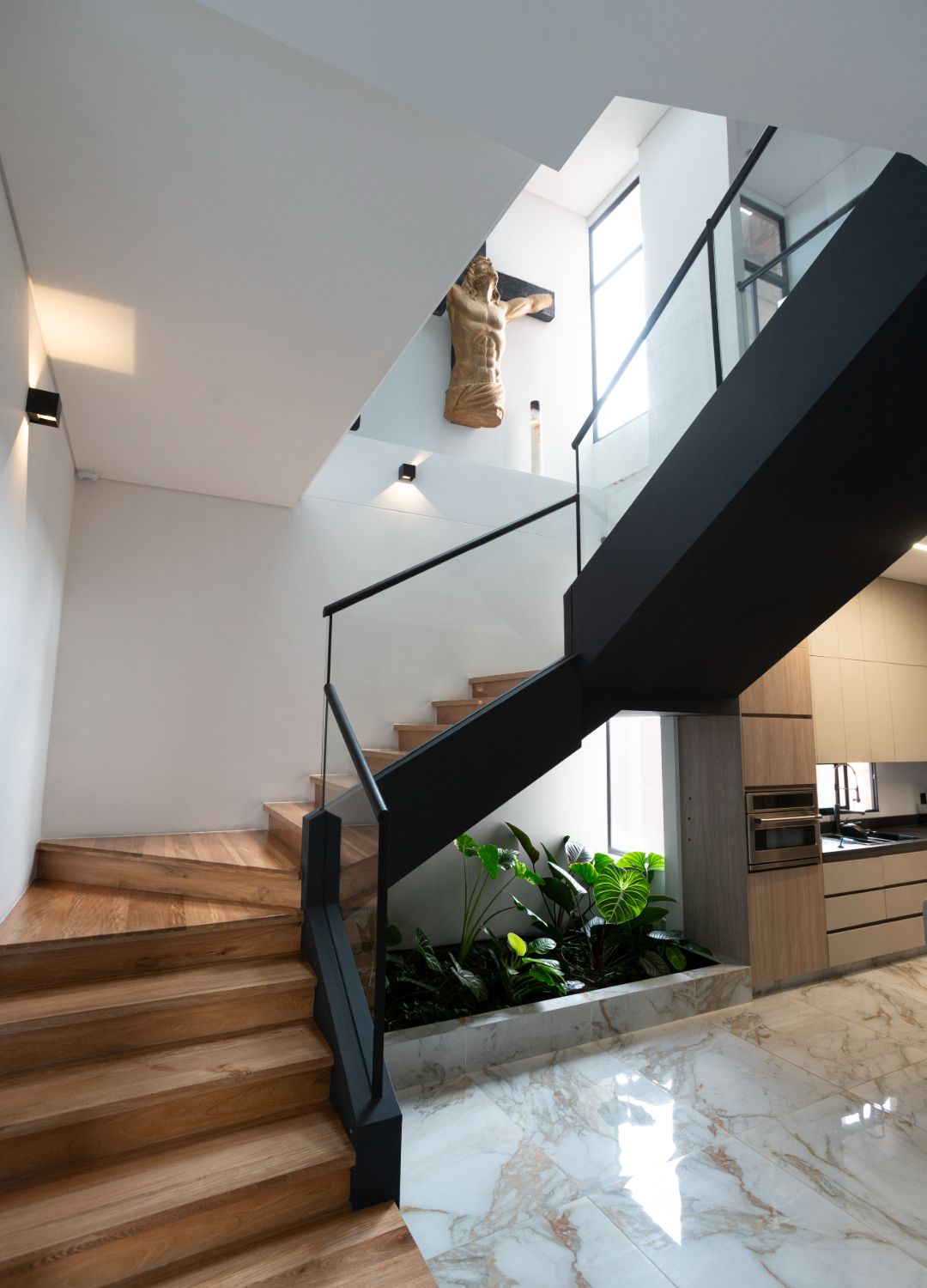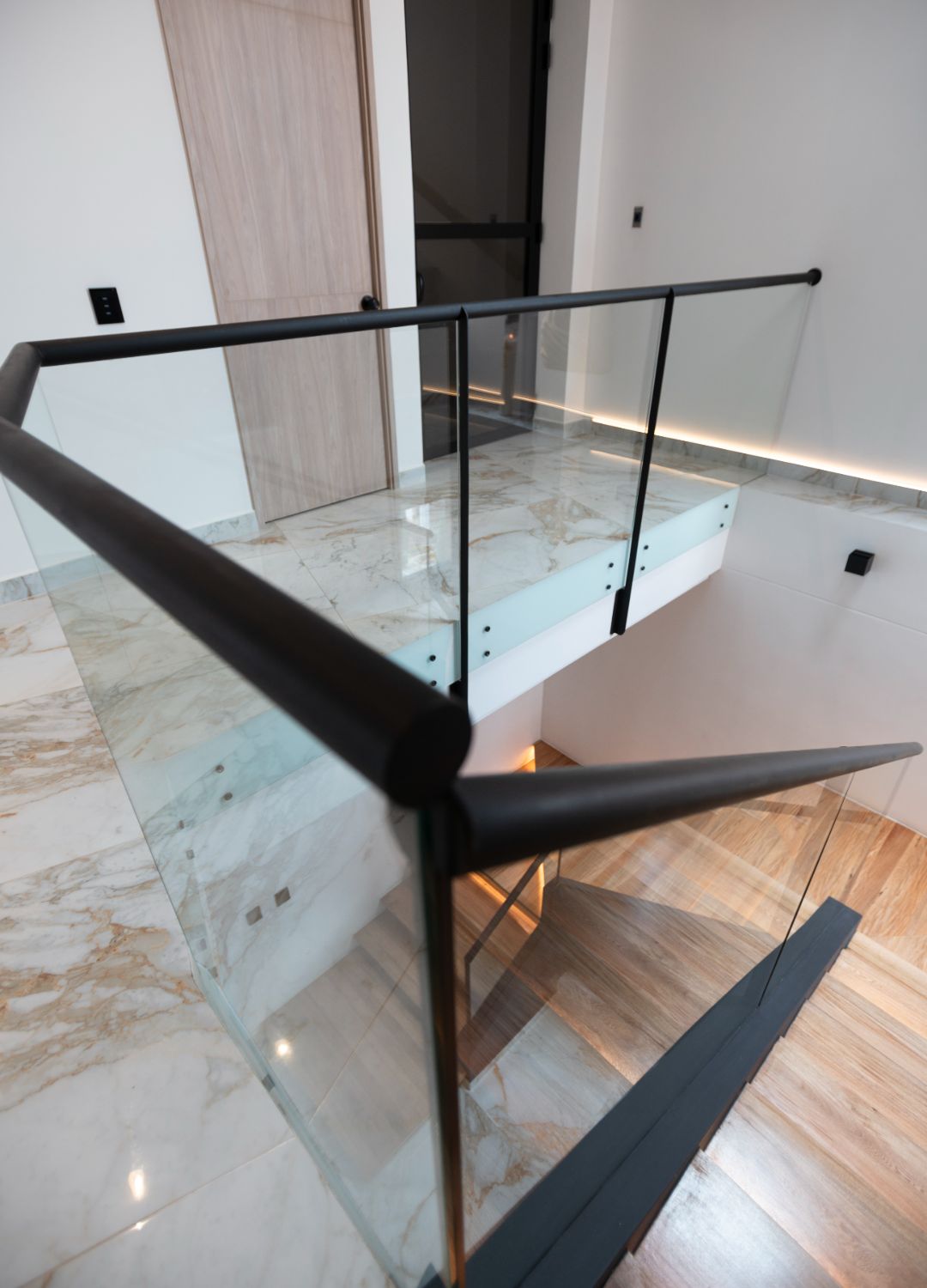 Pasamanos de escaleras en vidrio templado de 10 mm, instalados de parche a los peldaños de madera y platinas metálicas para mayor firmeza y estabilidad. Esta solución combina seguridad estructural con una estética ligera y moderna, dejando que la transparencia del vidrio destaque los acabados interiores.