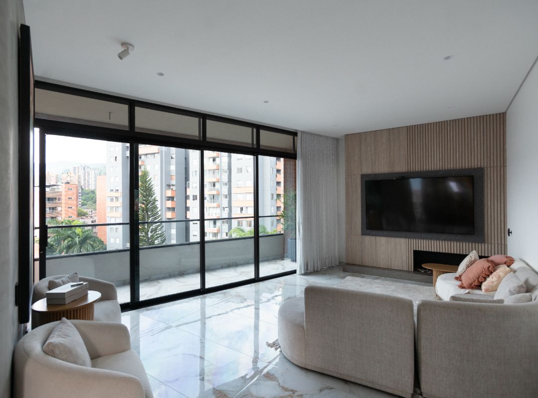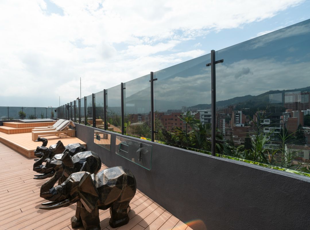 Pasamanos en terraza, elaborados en vidrio templado de 10 mm con película de control solar, instalados con postes verticales en platina de acero. Esta configuración proporciona seguridad perimetral sin bloquear la visual, aportando elegancia, resistencia y continuidad en el diseño exterior.