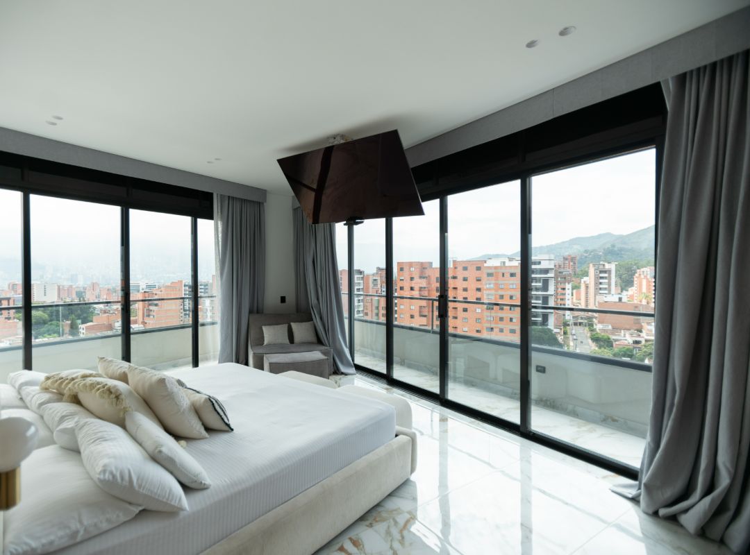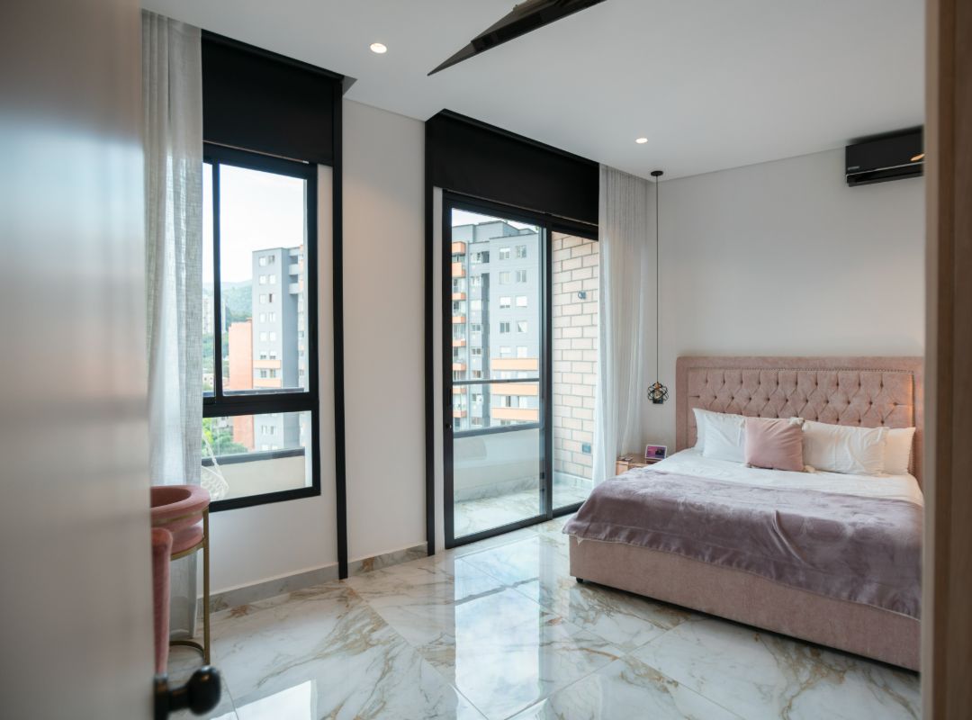 Las ventanas de habitaciones y otras zonas a alturas bajas fueron fabricadas en sistema 744, el cual es ideal para este tipo de espacios por su practicidad, seguridad y diseño. En algunos casos, estas ventanas incluyen un módulo fijo inferior, incorporado específicamente para brindar mayor protección sin sacrificar funcionalidad ni estilo.