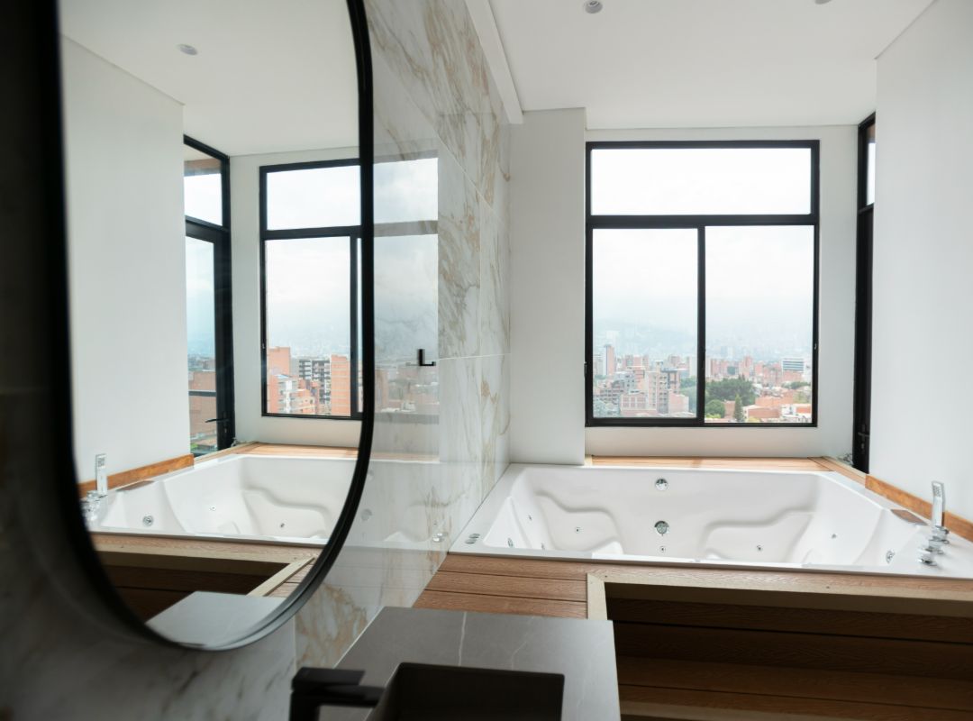 Por otro lado, los ventanales de mayor dimensión, tanto en habitaciones como en zonas comunes, fueron desarrollados en sistema monumental 70-38, un perfil más robusto, adecuado para cubrir amplias superficies. Algunos de estos ventanales incluyen módulos fijos en la parte superior, fabricados en sistema 38-31, para complementar el diseño arquitectónico general.